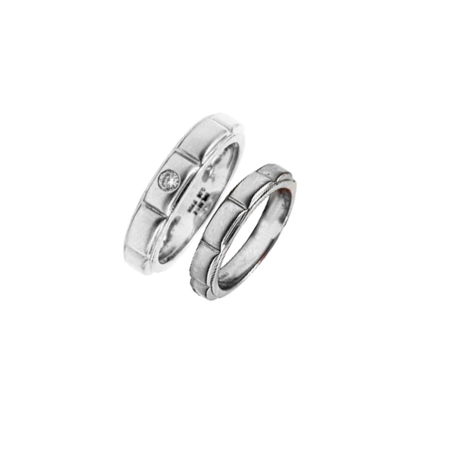 Crafted with timeless elegance, this stunning platinum couple band set symbolizes an unbreakable bond. Designed with a modern yet classic aesthetic, each ring features a sophisticated segmented pattern. One band is adorned with a single sparkling diamond, representing the brilliance of your shared journey, while the other showcases a clean, matching design — a perfect harmony of strength and grace. Ideal for engagements, anniversaries, or just because, these rings speak volumes without saying a word..