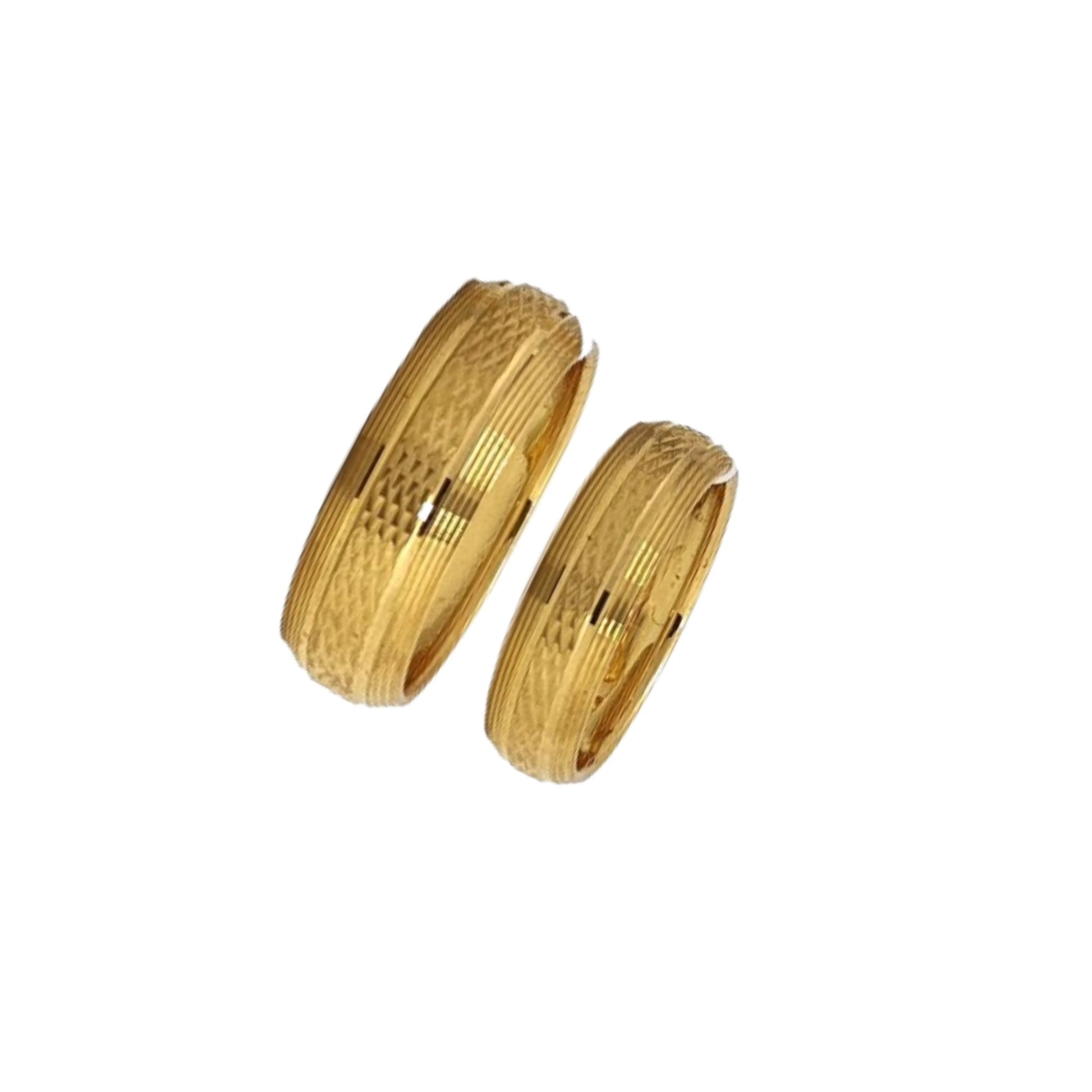 Celebrate your eternal bond with this exquisite pair of gold couple band rings. Crafted with precision and elegance, these matching bands feature a classic textured design with fine detailing along the edges, symbolizing timeless love and commitment. Made from high-quality gold, they offer both durability and a luxurious shine—perfect for engagements, weddings, or anniversaries. Whether you're exchanging vows or commemorating a special moment, these rings are a beautiful representation of your shared journey.