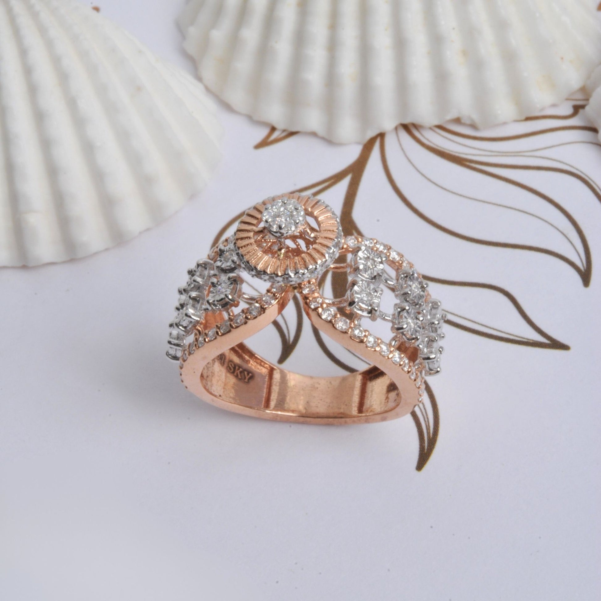 This exquisite diamond ring is crafted in luxurious 18K white gold and features a striking design adorned with all-natural diamonds. The diamonds are of G-H color and VS clarity, offering exceptional brilliance and sparkle. The intricate arrangement includes a radiant central motif complemented by delicate floral-inspired diamond accents and fine detailing along the band. Perfect for special occasions or everyday luxury, this ring blends modern elegance with timeless craftsmanship. Its wide, bold structure makes it a standout accessory, ideal for those who appreciate distinctive jewelry. A true celebration of beauty and sophistication, this piece elevates any jewelry collection.