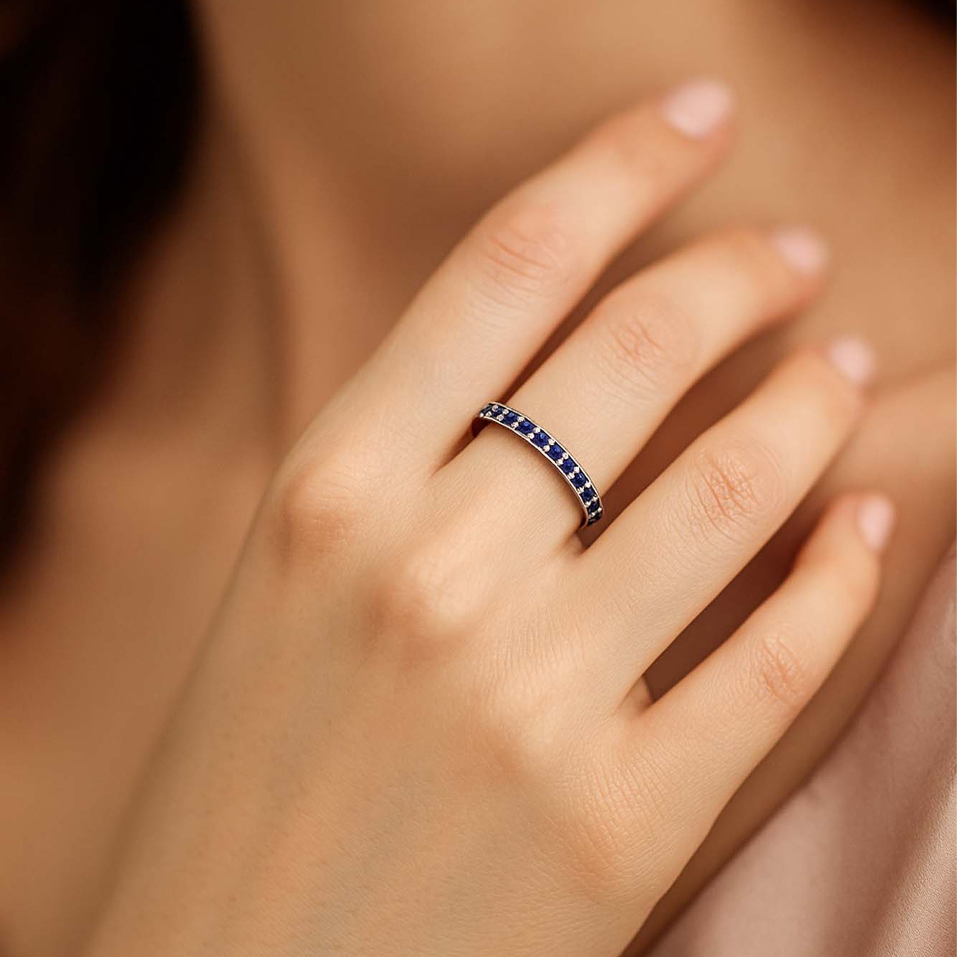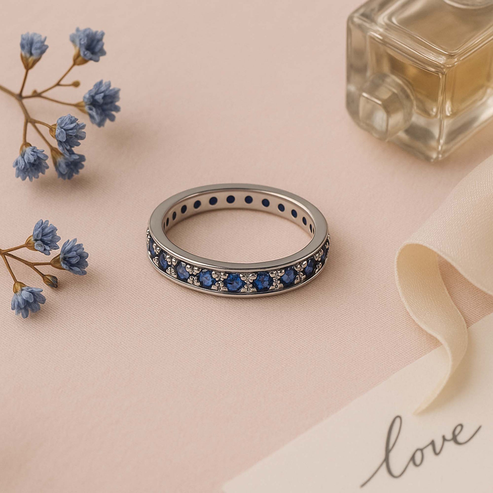 Crafted in lustrous 18K white gold, this timeless band showcases a stunning row of alternating deep blue sapphires and dazzling round-cut diamonds. The elegant eternity design symbolizes everlasting love and refined beauty, making it perfect for weddings, anniversaries, or daily wear. Each gemstone is expertly set to ensure brilliance and durability, while the slim, graceful silhouette makes it ideal for stacking or wearing solo. A piece that blends classic charm with modern sophistication.