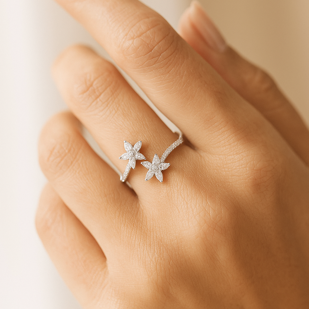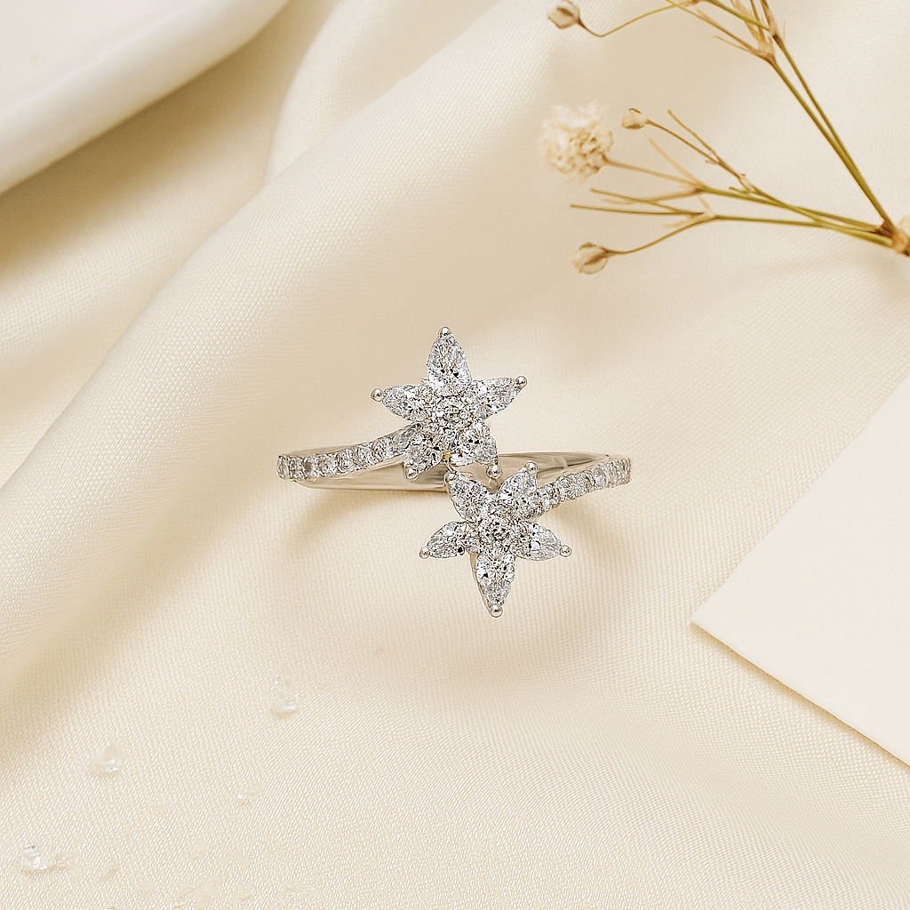 Delicate and dazzling, this floral diamond bypass ring is a celebration of beauty and femininity. Crafted in luminous 18K white gold, the ring features two blooming floral motifs adorned with a mix of marquise and round-cut diamonds, artistically arranged to resemble sparkling blossoms. The slender band is pavé-set with additional diamonds, enhancing the brilliance and charm of the design. Perfect for romantic occasions or as a unique everyday luxury piece, this ring effortlessly combines nature-inspired elegance with modern sophistication.
