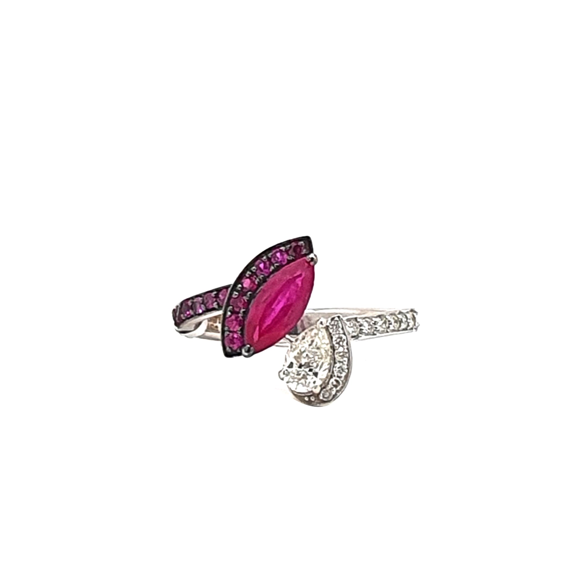 Make a bold statement with this captivating dual-stone open ring, featuring a vivid marquise-cut ruby paired with a sparkling pear-shaped diamond. Expertly crafted, the ring showcases a striking bypass design that symbolizes harmony and balance. The ruby is surrounded by a halo of round-cut pink sapphires, enhancing its deep red hue, while the pear diamond is delicately set with a pave band for extra brilliance. A stunning fusion of passion and purity, this ring is perfect for those who embrace individuality with elegance.
